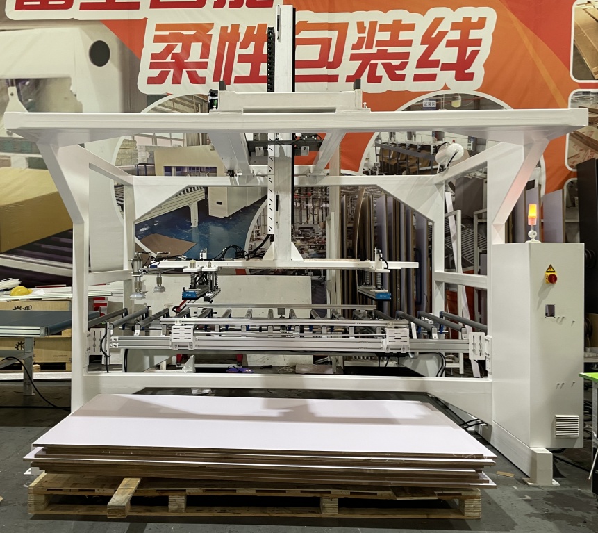1. Paghahanda ng Paghahanda: Inilalagay ng mga manggagawa ang buong mga palyete ng mga naproseso na mga panel na batay sa kahoy sa rack ng pagpapakain ng kagamitan. Ang platform ng pag -aangat ng rack ay awtomatikong nag -aayos sa paunang taas na pagkakahawak.
